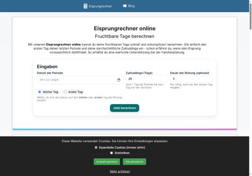 Mit eisprungrechner-online.de kannst du ganz unkompliziert deinen Eisprung online berechnen und so ein besseres Verständnis für deinen Zyklus gewinnen. Unser kostenloser Eisprungrechner zeigt dir zuverlässig, wann deine fruchtbaren Tage liegen und wann die Wahrscheinlichkeit für eine Schwangerschaft am höchsten ist. Die Anwendung ist einfach: Du trägst die Länge deines Zyklus und den ersten Tag deiner letzten Periode ein, und schon erhältst du eine übersichtliche Berechnung. So kannst du gezielt deine Chancen auf eine Empfängnis erhöhen oder deine natürliche Familienplanung unterstützen.